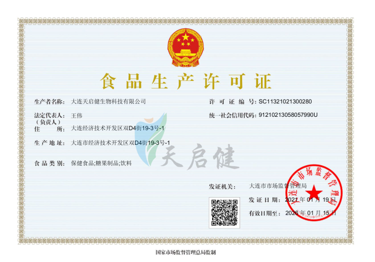 大連天啟健生物科技有限公司創建于2012年,是一家專業從事食品、保健食品的研發、生產和銷售的企業。 公司座落于風景秀美、碧海連天的大連經濟技術開發區。 公司按照新版GMP認證標準建立的保健食品固體制劑車間,擁有先進生產設備的硬膠囊劑、片劑、顆粒劑、粉劑四條生產線及預包裝食品(固體飲料、壓片糖果)的生產資質。擁有高標準的產品檢測中心和研發中心,確保產品質量不負大眾健康需求。 公司以“服務于高品質健康產業、造福大眾、回歸自然平衡”為己任,全面致力于健康產業的研發和生產。公司秉承“上天啟示、承運健康、誠實守信、開拓創新”的經營理念和勤勉務實的專業精神,堅持走專業化道路發展健康產業。